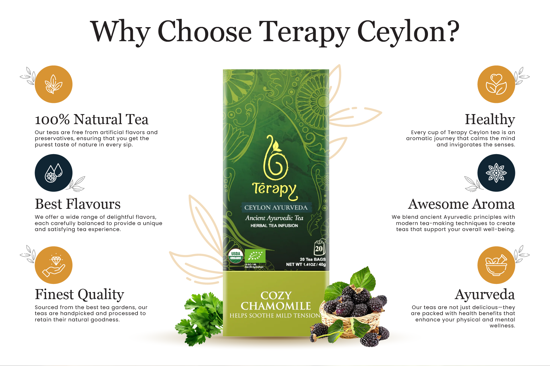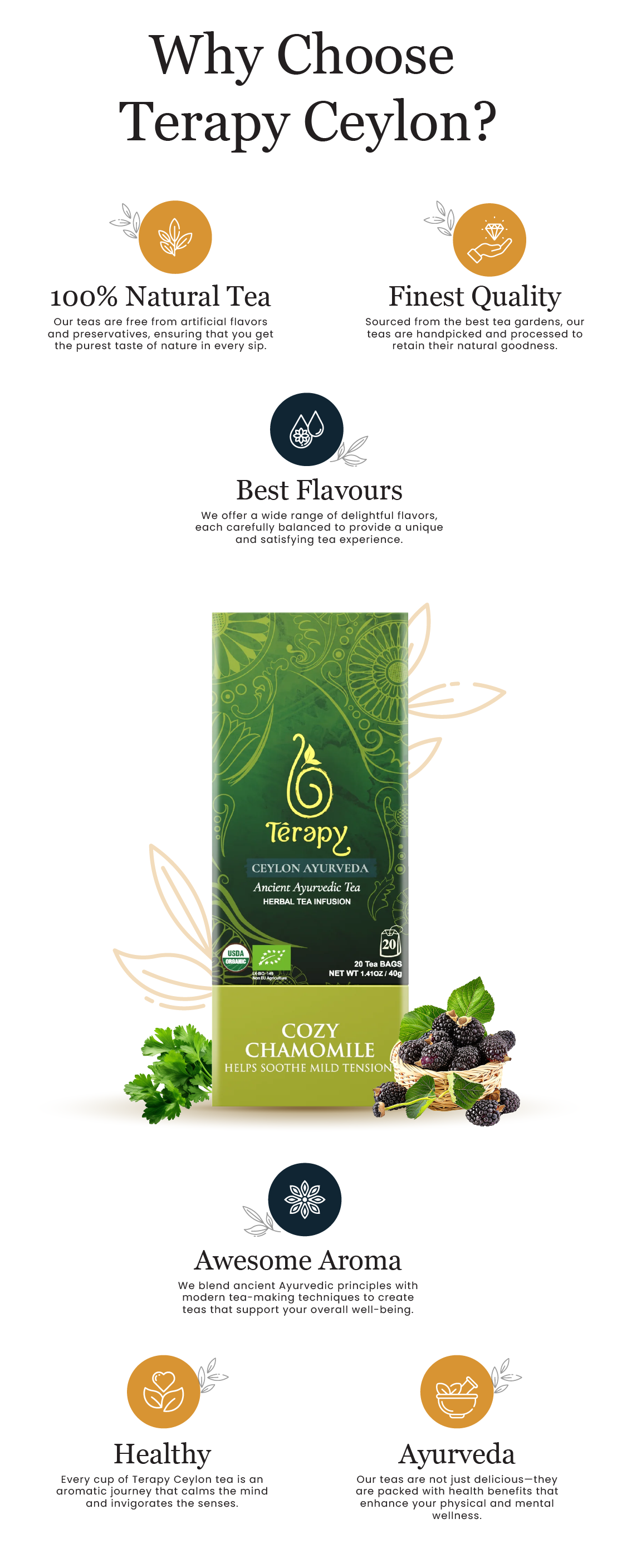 Terapy Ceylon, and I am absolutely thrilled with their premium teas! As someone who values both quality and health benefits in my beverages, this brand truly stands out. The teas are not only 100% natural, but they also come infused with Ayurvedic essence, which has brought a whole new level of wellness to my daily routine.